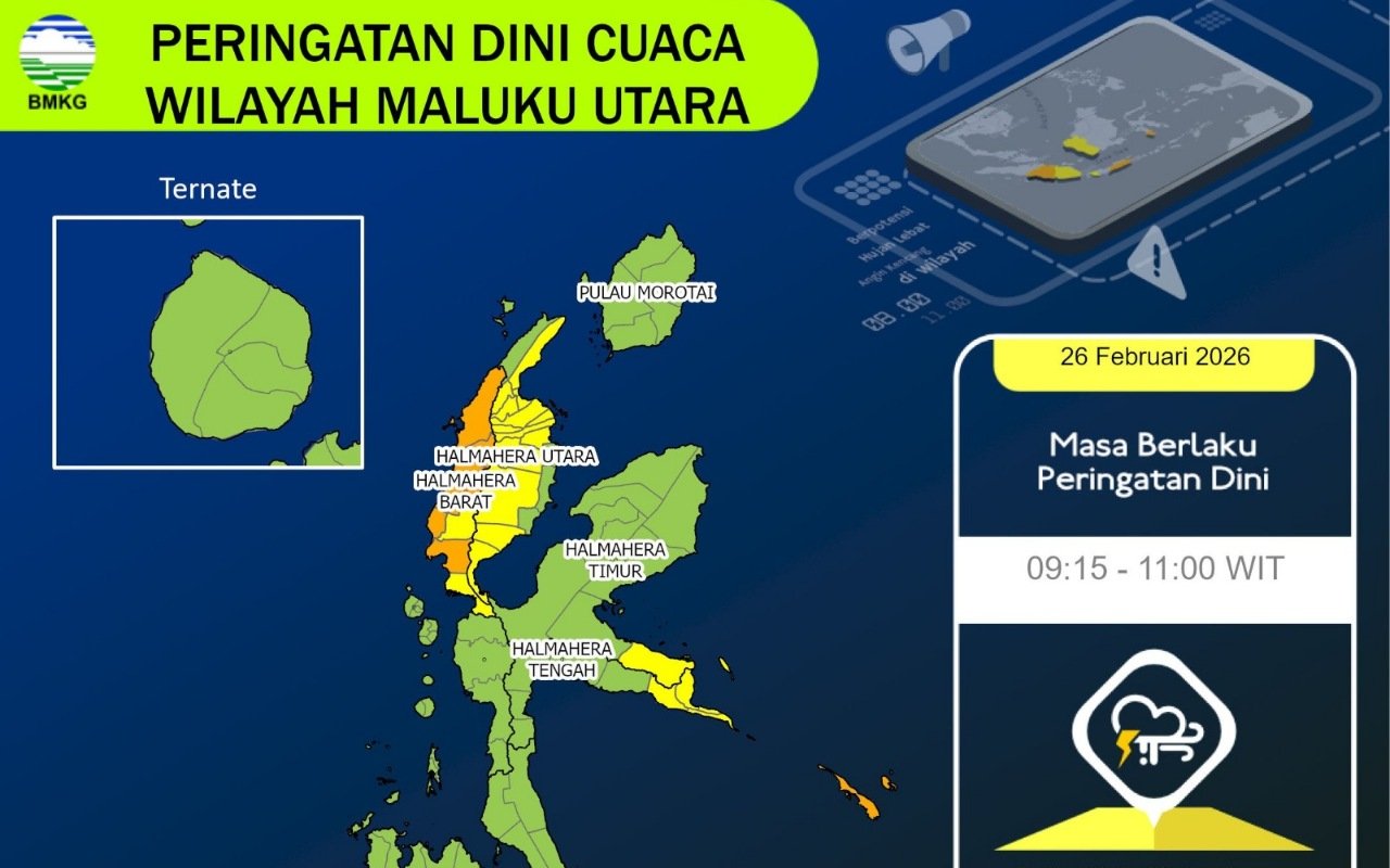 BMKG membagi periode peringatan cuaca ini ke dalam tiga fase penting: 26 – 27 Februari potensi hujan intensitas ringan hingga sedang di hampir seluruh wilayah kabupaten/kota di Maluku Utara.
