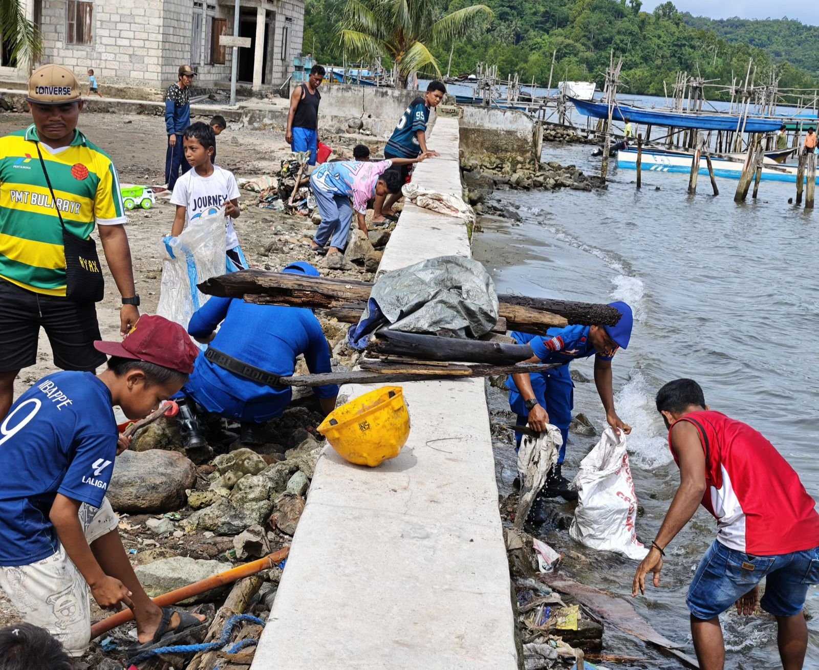 Antusiasme warga bahu-membahu bersama personel Polri membersihkan sampah di sepanjang garis pantai Desa Alam Pelita. Kegiatan yang berlangsung hingga pukul 10.00 WIT ini berjalan dengan aman dan lancar.