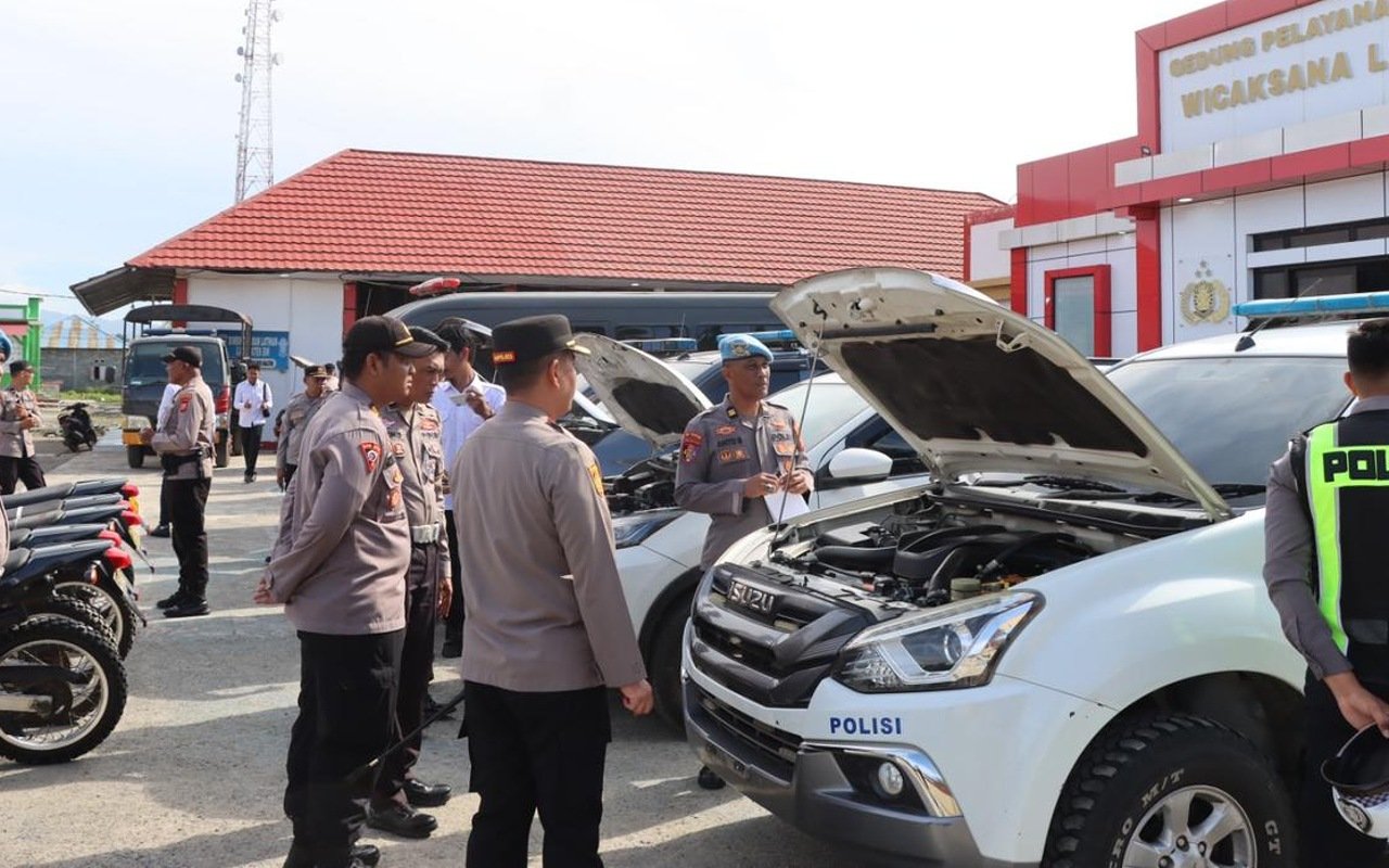 Pemeriksaan fisik kendaraan operasional, baik roda dua maupun roda empat, guna memastikan seluruh armada dalam kondisi layak pakai untuk mobilitas patroli di lapangan.
