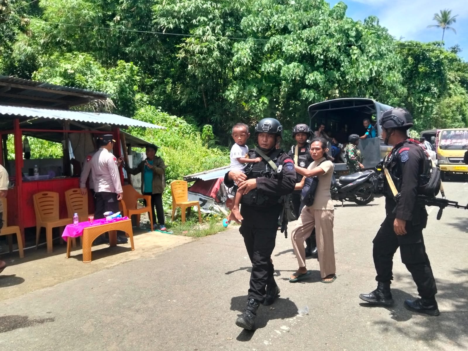 Kehadiran aparat menjadi penanda negara hadir menjamin rasa aman bagi warganya.Proses evakuasi melibatkan berbagai armada, mulai dari bus dan truk milik Satuan Brimob, kendaraan TNI, hingga armada Polres Halmahera Tengah.