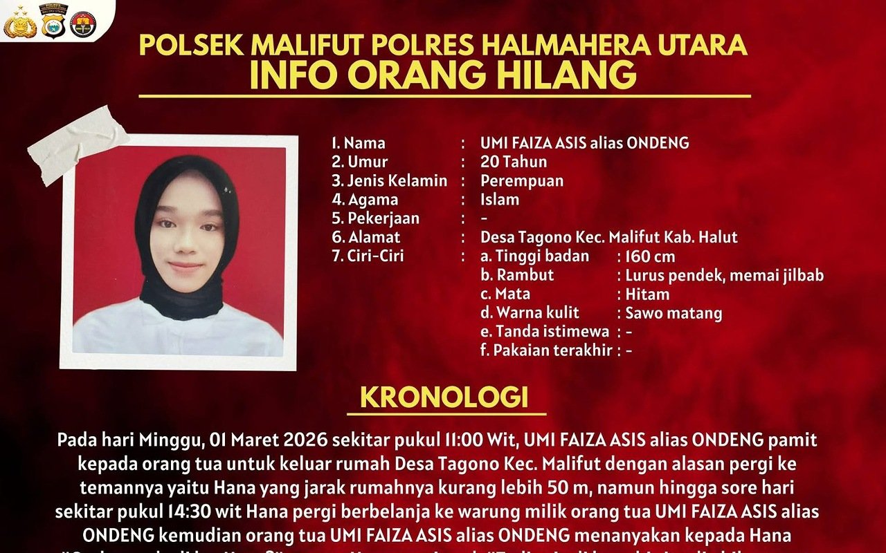 MarahaiNews,id- Seorang warga Desa Tagono, Kecamatan Malifut, Kabupaten Halmahera Utara, bernama Umi Faiza Asis (20 tahun) yang akrab disapa Ondeng, dilaporkan hilang sejak Minggu (1/3/2026). Hingga kini, keberadaan yang bersangkutan belum diketahui.