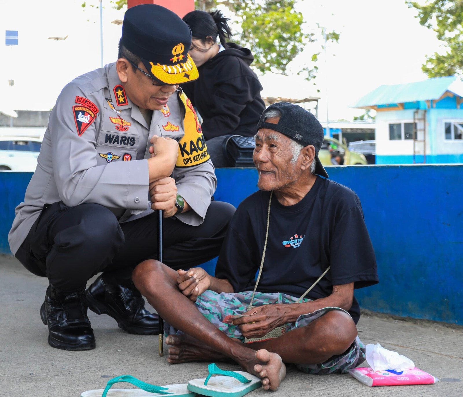 Di sela peninjauan, Irjen Waris terlihat berdialog dengan seorang warga lanjut usia. Ia duduk sejajar dan berbincang santai, menunjukkan kepedulian di tengah meningkatnya aktivitas mudik.