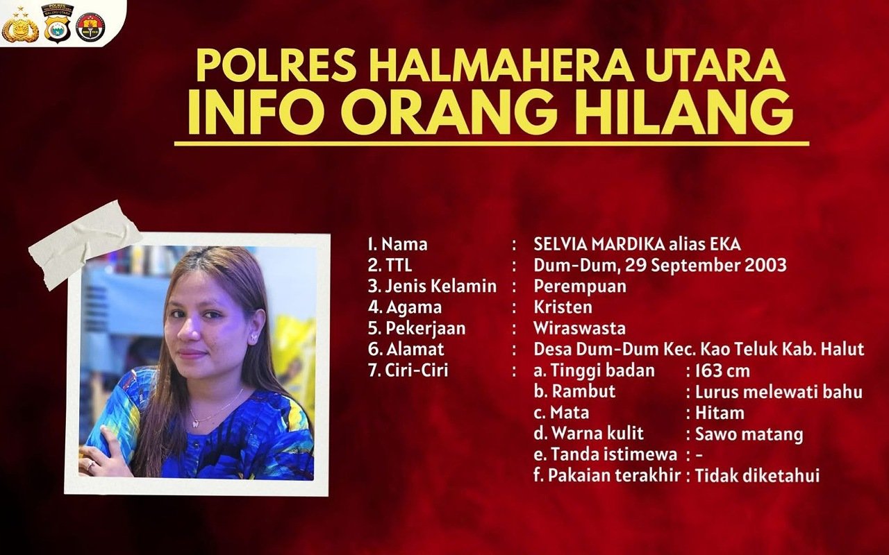 MarahaiNews, id.– Pihak keluarga bersama Kepolisian Resor (Polres) Halmahera Utara meminta bantuan masyarakat untuk menemukan keberadaan seorang wanita bernama Selvia Mardika alias Eka, warga Desa Dum-Dum, Kecamatan Kao Teluk, yang dilaporkan hilang sejak Jumat lalu.